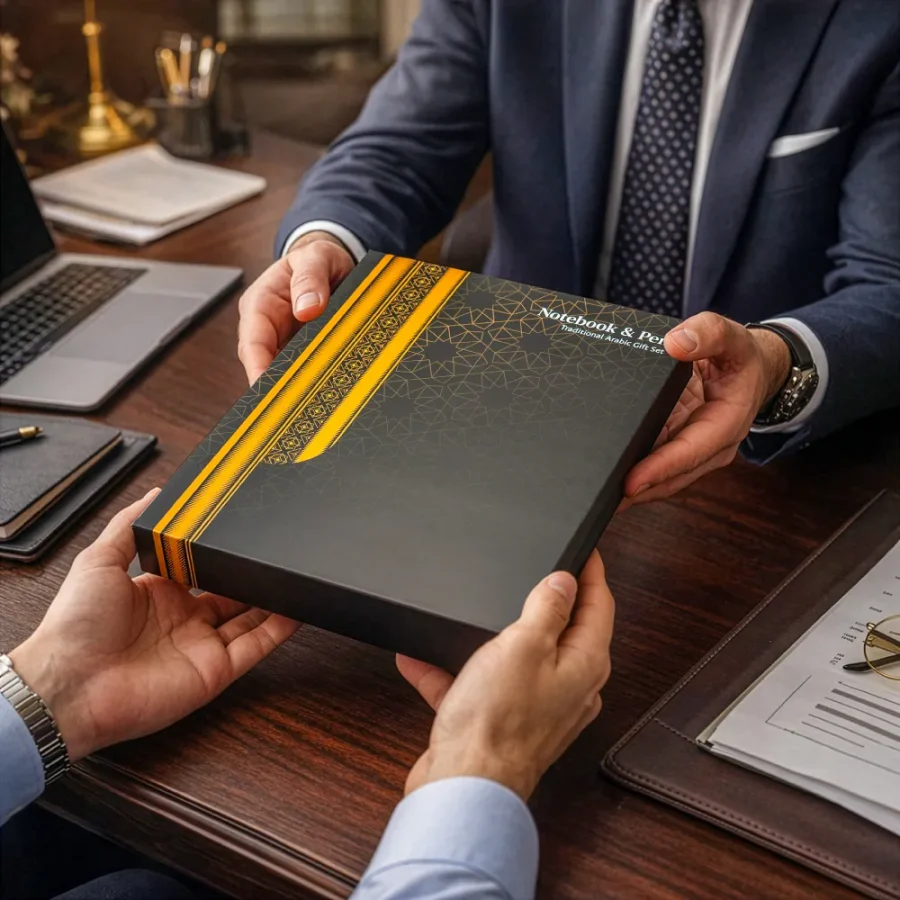 Arabic Tradition Gift Set with Bisht-Design Notebook and Metal Pen in a premium-themed hardboard gift box—ideal for executive gifts and promotional branding in the UAE and the Middle East.