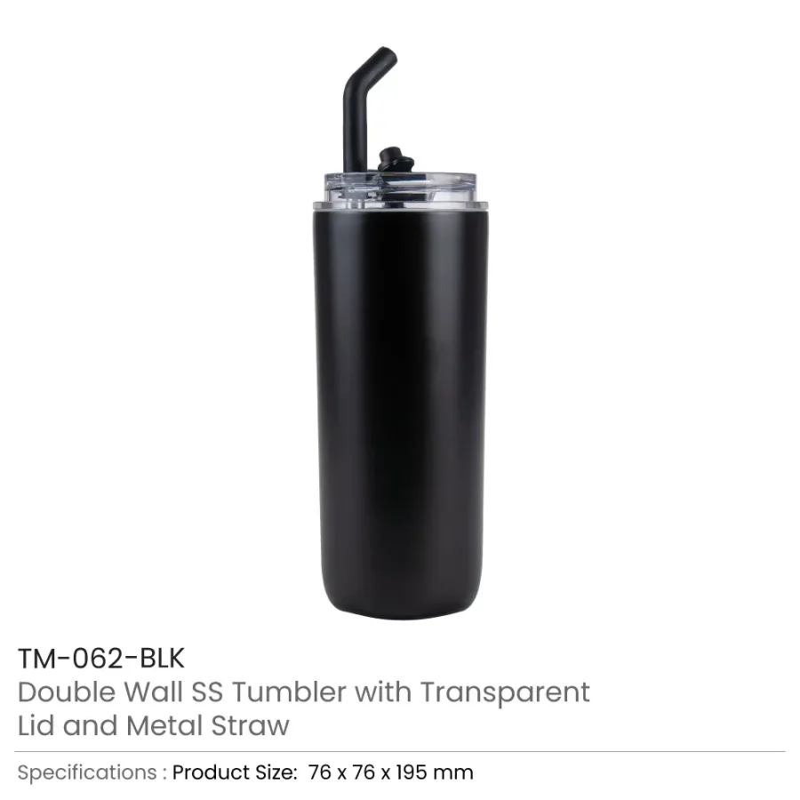 Double Wall SS Tumbler with Transparent Lid and Metal Straw – 500ml