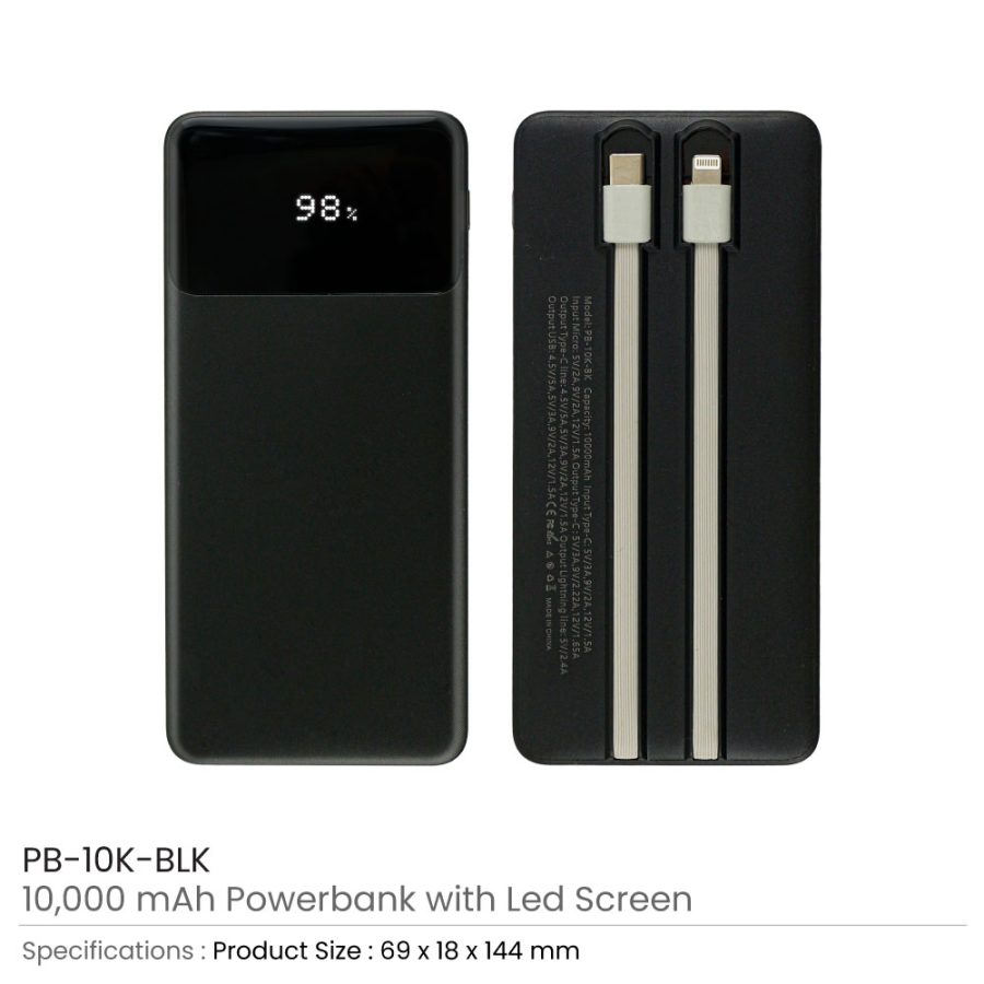 Powerbank with LED Screen 10,000 mAh & Type C Built-in Cables