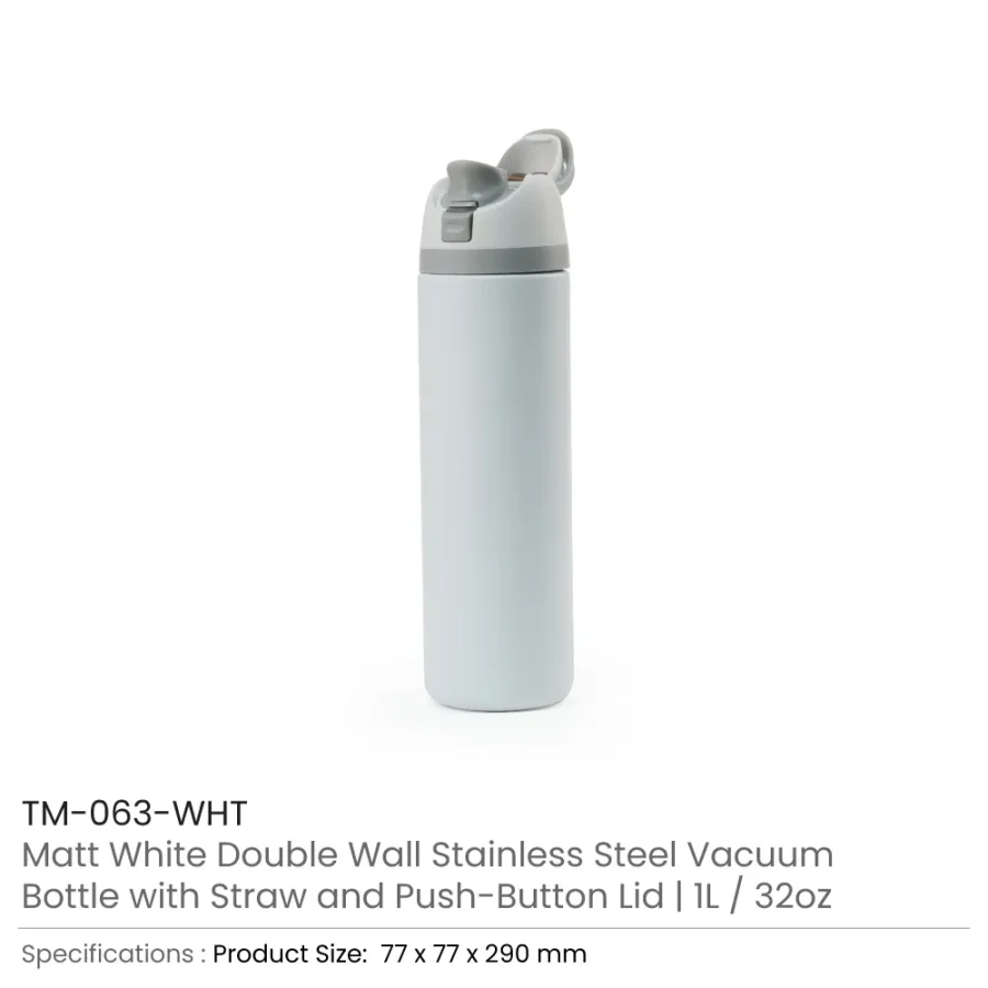 Double-wall stainless steel vacuum bottles with an easy push-button lid and integrated straw — keep beverages hot or cold for hours. Sleek matt oil finish available in Black and White. Ideal for daily use, travel, and corporate giveaways.