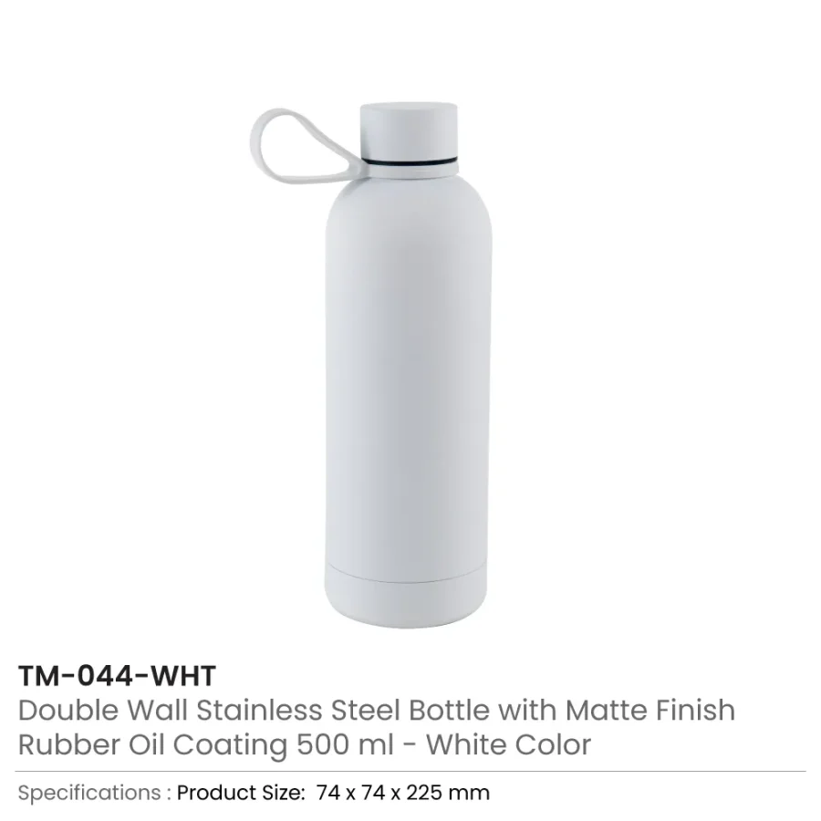 Stay hydrated in style with our premium Stainless Steel Water Bottles, featuring a soft-touch rubberized coating and a matte finish for a comfortable grip and a modern look. Designed with a double-wall vacuum structure, it maintains temperature effectively — keeping drinks cold for up to 24 hours and hot for up to 12 hours. The leakproof twist cap and detachable silicone handle make it convenient and portable for daily use. Available in four stylish colors — black, blue, white, and green — this BPA-free 500ml bottle is the perfect eco-friendly choice for corporate gifting, promotions, and personal use.