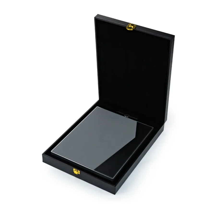 - Packaging: Luxury vertical-opening black fiberboard box with gold lock closure